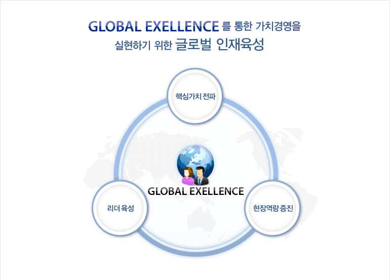 영업, 생산, 연구, 관리 직군별로 단계적 교육과정을 제공하여 전사원의 현장역량을 증진시킴으로써 궁극적으로는 Global Excellence를