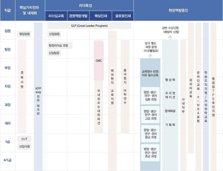 따라서 각 계층별로 제공되는 다양한 리더육성 교육을 통해 '팀 리더'를 양성하며 최종적으로는 KFP를 이끌어갈 '경영리더'를 육성합니다.